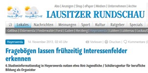 Ende der Sek I, Anfang Sek II rückt die Frage nach der beruflichen Zukunft immer mehr in den Mittelpunkt und bei der Vielfalt an Möglichkeiten wird die Berufs- und Studienwahl eine echte Herausforderung. Waren es 2004 laut Hochschulkompass noch ca. 11000 Studiengänge, sind es heutzutage um ein Vielfaches mehr, die für eine bzw. die richtige Entscheidung zur Verfügung stehen. Da kann einem schon mal der Blick für das Wesentliche verloren gehen. Und um den Blick wieder zu schärfen, Trends zu ermitteln und das Feld vorab etwas zu sondieren, führen wir, die Mitarbeiter der Schüleragentur, regelmäßig Studienwunschumfragen an den Hoyerswerdaer Gymnasien durch. Ansatz der Umfragen ist zum einen die rechtzeitige Auseinandersetzung mit der komplexen Thematik und zum anderen das Hinterfragen der eigenen Persönlichkeit. "Was kann ich?", "Was will ich?" und "Wo soll die berufliche Reise hingehen?" Auskünfte auf alle Fragen in Sachen Karriereplanung gab es am 12.11.2013. Namhafte Unis, Hoch- und Fachschulen sowie Institutionen hatten sich angemeldet, um unsere Gymnasiasten bei der Berufs- und Studienorientierung zu unterstützen. Dieser Tag bot die einmalige Gelegenheit in der Zeit von 10:00 bis 14:00 Uhr am Beruflichen Schulzentrum "Konrad Zuse" mit vielen Vertretern persönlich ins Gespräch zu kommen, zu erkunden, was in den "Wunsch"-Studiengängen konkret erwartet wird und welche Zulassungsvoraussetzungen bestehen. Auch wer zwischen dem Abitur und dem Studium eher eine "Auszeit" nehmen möchte, konnte sich über Möglichkeiten, wie das "Freiwillige Soziale Jahr", den Bundesfreiwilligendienst oder Auslandsaufenthalte bei den entsprechenden Trägern ausführlich informieren. Zudem erfuhren die Schüler und Schülerinnen in dem umfassenden Angebot an Allgemein- und Fachvorträgen, womit sich beispielsweise Wirtschaftswissenschaftler oder Agrarwirtschaftler beschäftigen, welche Aufgabenbereiche bearbeitet werden und natürlich auch, für welche beruflichen Tätigkeiten die Studiengänge qualifizieren und welche Perspektiven sich mit ihnen verbinden. Nicht zu vergessen, wie finanziere ich das Ganze!